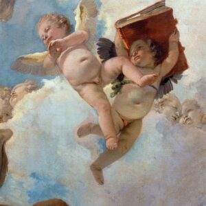 Angel with scrolls and putti taking the book detail